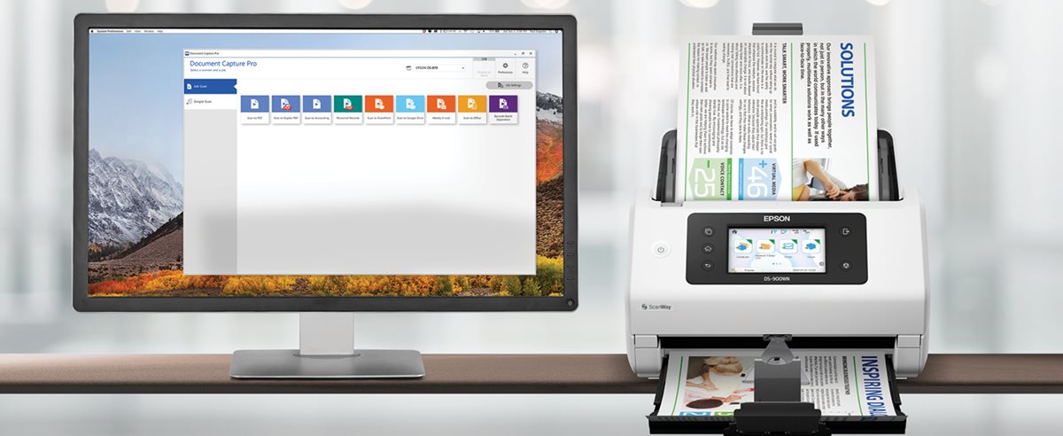 The DS-900WN is designed to be the perfect edge device for pulling digitized scan data into your document management solutions. EdgeLink™ scanners from Epson have built-in integrations with supported third-party software platforms. This allows end users to access their applications directly through the scanner’s large 4.3" color touchscreen. For smaller businesses and organizations, Epson’s powerful Document Capture Pro software is included, with features such as scanning to searchable PDF files. With accurate, high-quality scans at speeds up to 70 ppm/140 ipm1 and a 100-page Auto Document Feeder (ADF), the DS-900WN is engineered to bring speed, reliability and ease of use to your workflows. The scanner also supports ScanWay™ PC-free scanning, allowing you to scan to a USB flash drive2, email3, network folders3 or popular cloud services4 without the need to install any software. For implementations needing advanced administration, Epson offers a robust suite of optional solutions for the scanner that facilitate centralized management, reporting, and server-based capture and authentication (including Active Directory). Make document management work for you with the exceptional DS-900WN.