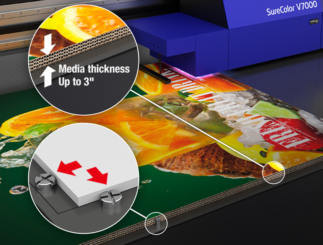 The SureColor-V7000 automatically detects and adjusts to accommodate media up to 3" thick, and the four print zones easily hold media in place securely. It prints directly onto foam board, poster board, real estate signage, and on a variety of materials, including wood, metal, and acrylic. Combined with simple intuitive Epson Edge Print software, which allows for easy setup and simple file management, color control, screening, step and repeat, and nesting, printing is a breeze.